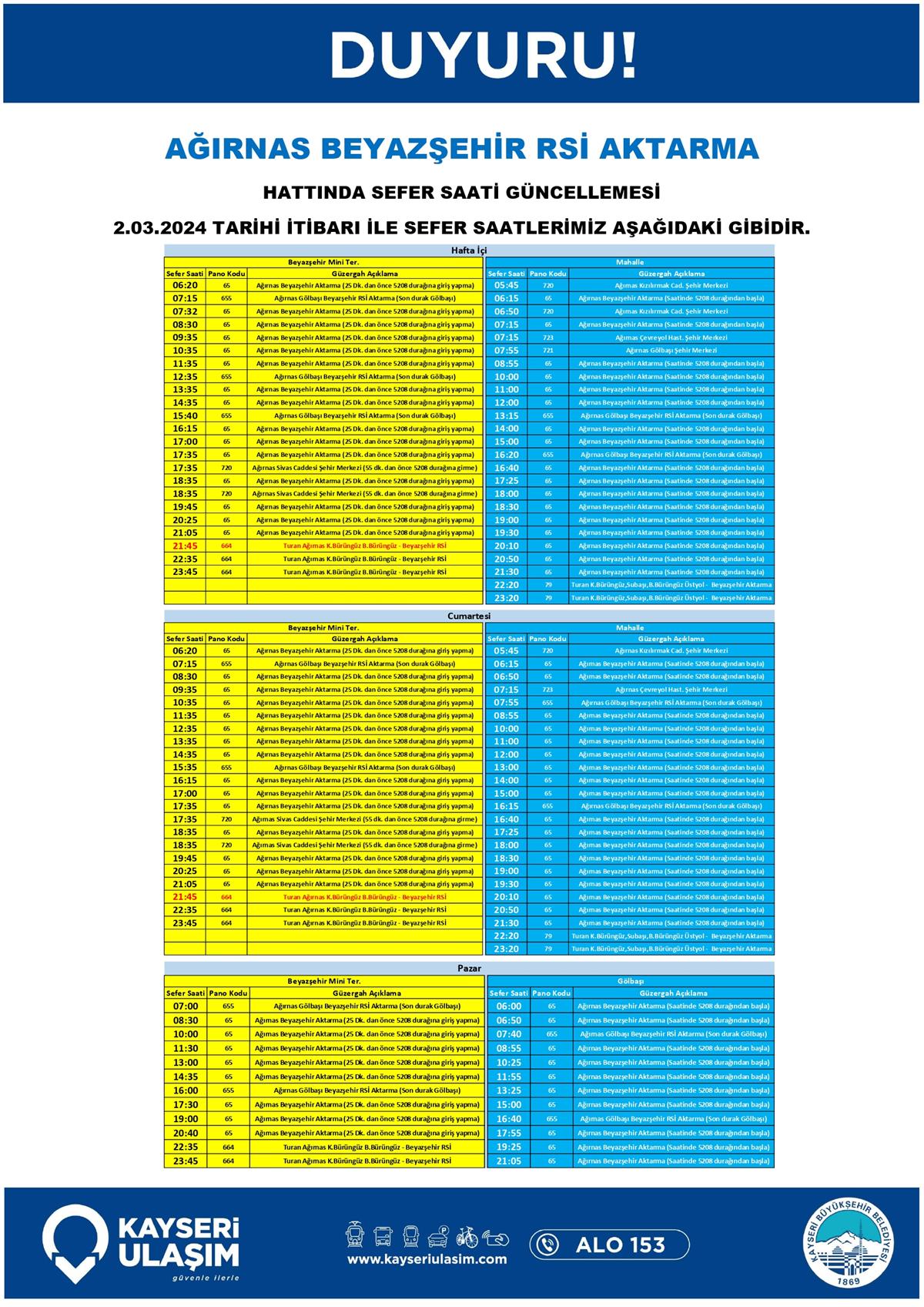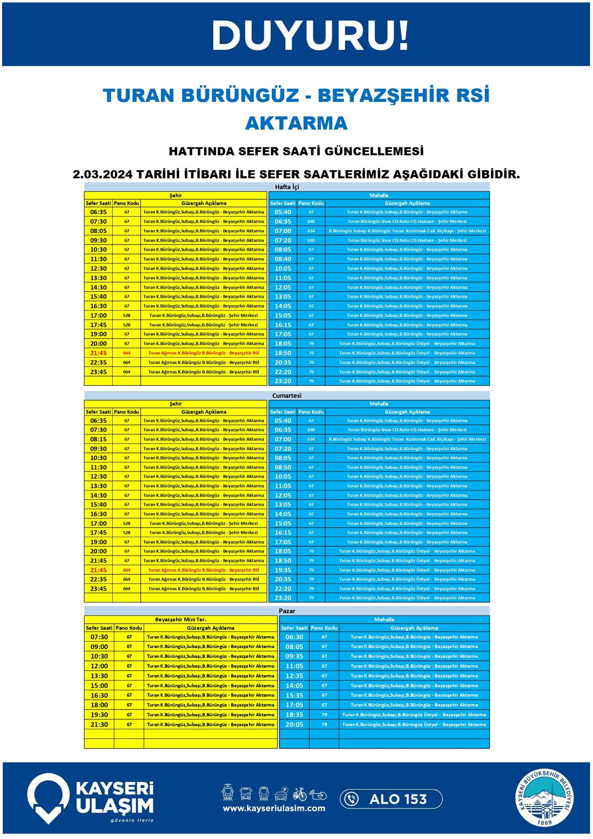 1- 436-441-443-448-449 HAT KODLU ERKİLET HATLARINDA VE 196-197-198 ERKİLET RİNG HATLARI GÜZERGÂH SON DURAK GÜNCELLEMESİ 2- AĞIRNAS BEYAZŞEHİR RSİ AKTARMA HATTINDA SEFER SAATİ GÜNCELLEMESİ 3- ORGANİZE AKTARMA SERBEST BÖLGE AĞAÇ İŞLERİ RİNG HATTINDA SEFER SAATİ GÜNCELLEMESİ 4- TAHİRİNLİ KÜLLÜ KARAHÖYÜK ANAFARTALAR RSİ AKTARMA HATTINDA SEFER SAATİ GÜNCELLEMESİ 5- TURAN BÜRÜNGÜZ - BEYAZŞEHİR RSİ AKTARMA HATTINDA SEFER SAATİ GÜNCELLEMESİ 02-04 Mart 2024 Tarihinden itibaren Bazı Sefer Saat ve Güzergah Güncellemeleri Yapılmıştır.