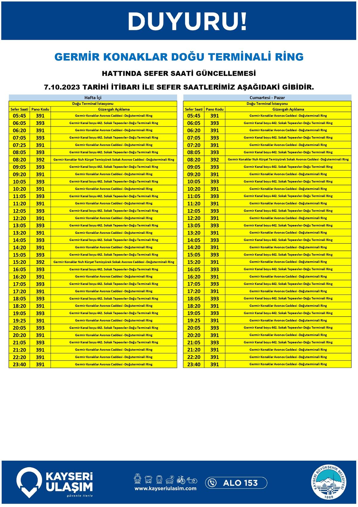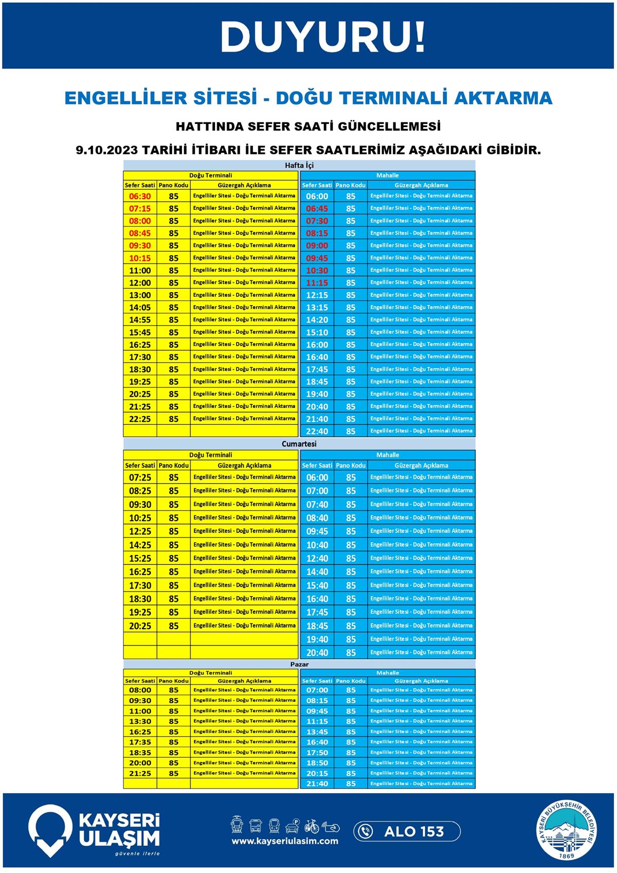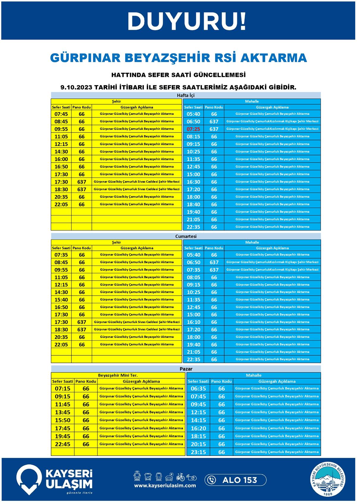 07 – 09 Ekim 2023 Tarihi İtibari İle Bazı Sefer Saat ve Güzergah Güncellemeleri Yapılmıştır.