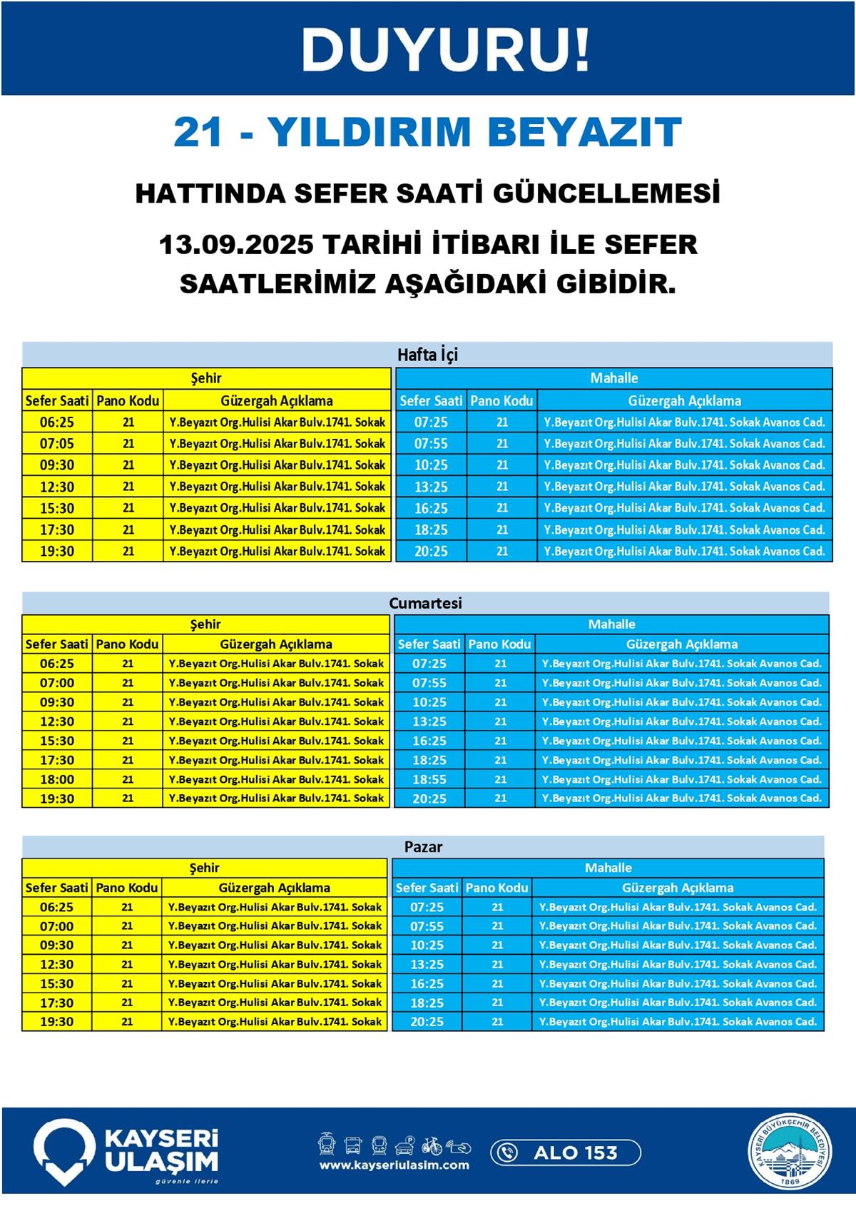 13 Eylül 2025 Tarihinden itibaren Bazı Sefer Saat ve Güzergâh Güncellemeleri Yapılmıştır.