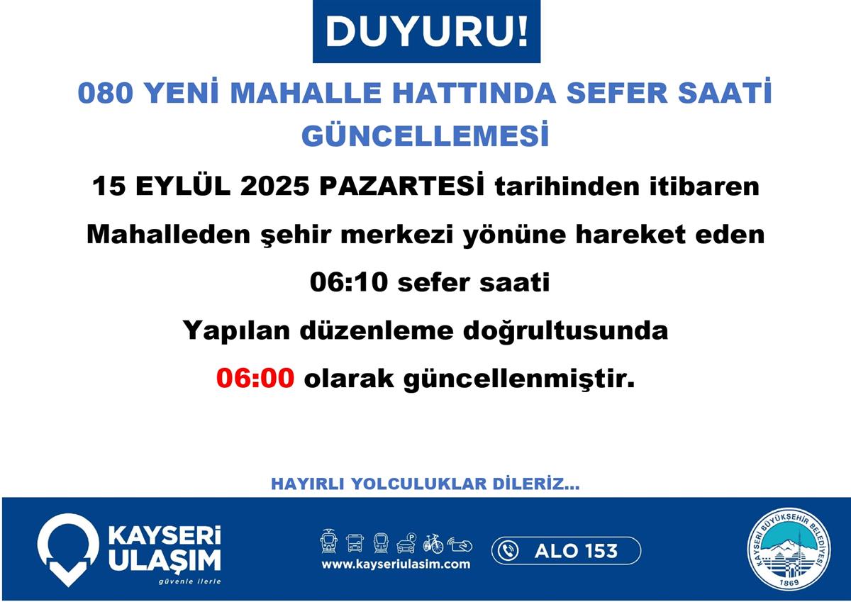 BAŞAKPINAR KURUKÖPRÜ ÇATAKDERE TALAS BELEDİYESİ RSİ AKTARMA HATTINDA SEFER SAATİ GÜNCELLEMESİ