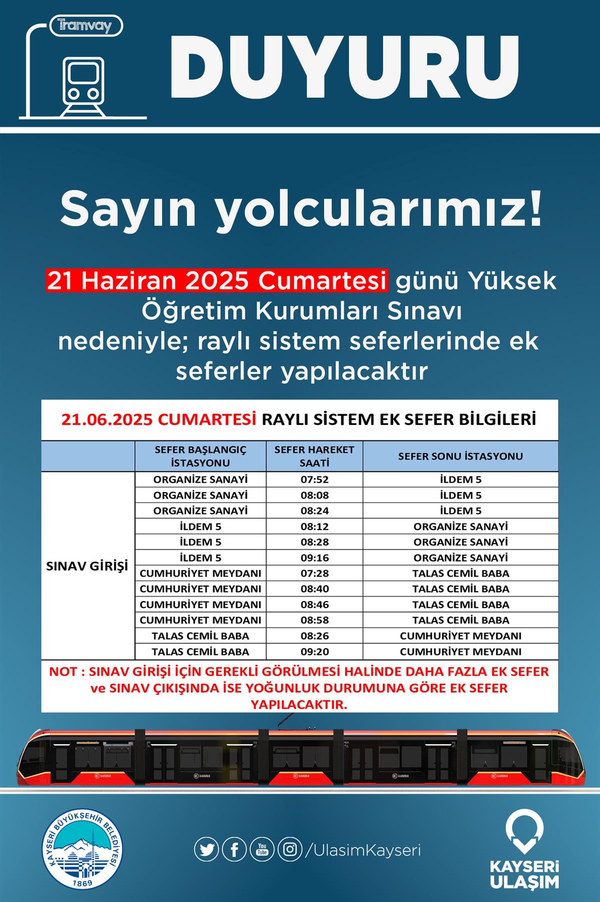 21 - 22 Haziran 2025 Cumartesi ve Pazar günü Yükseköğretim Kurumları Sınavı (YKS) nedeniyle raylı sistem seferlerinde ek seferler yapılacaktır