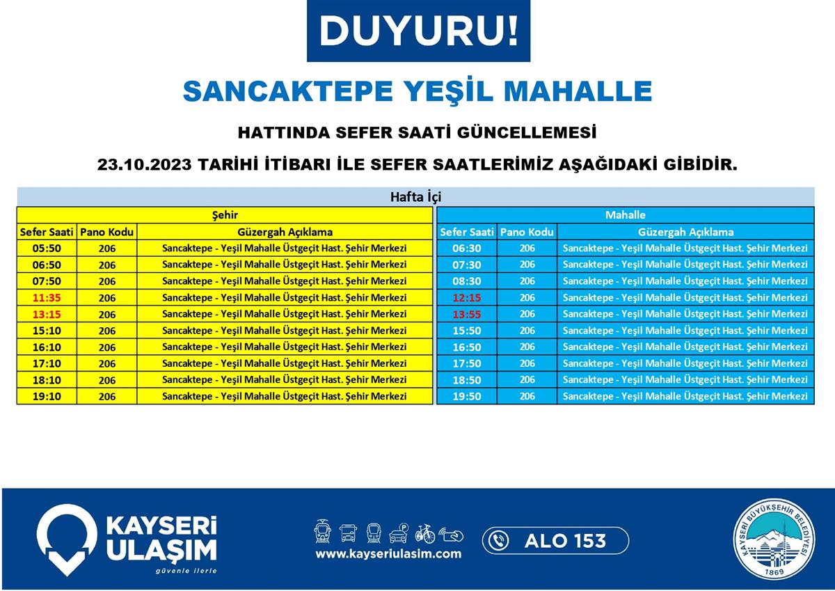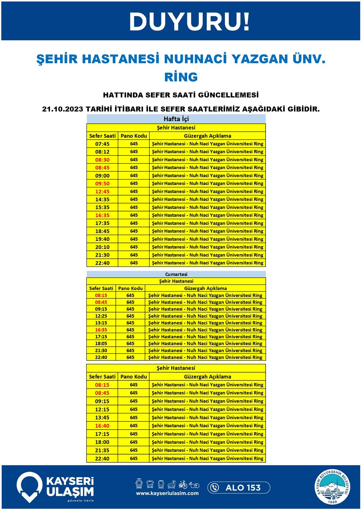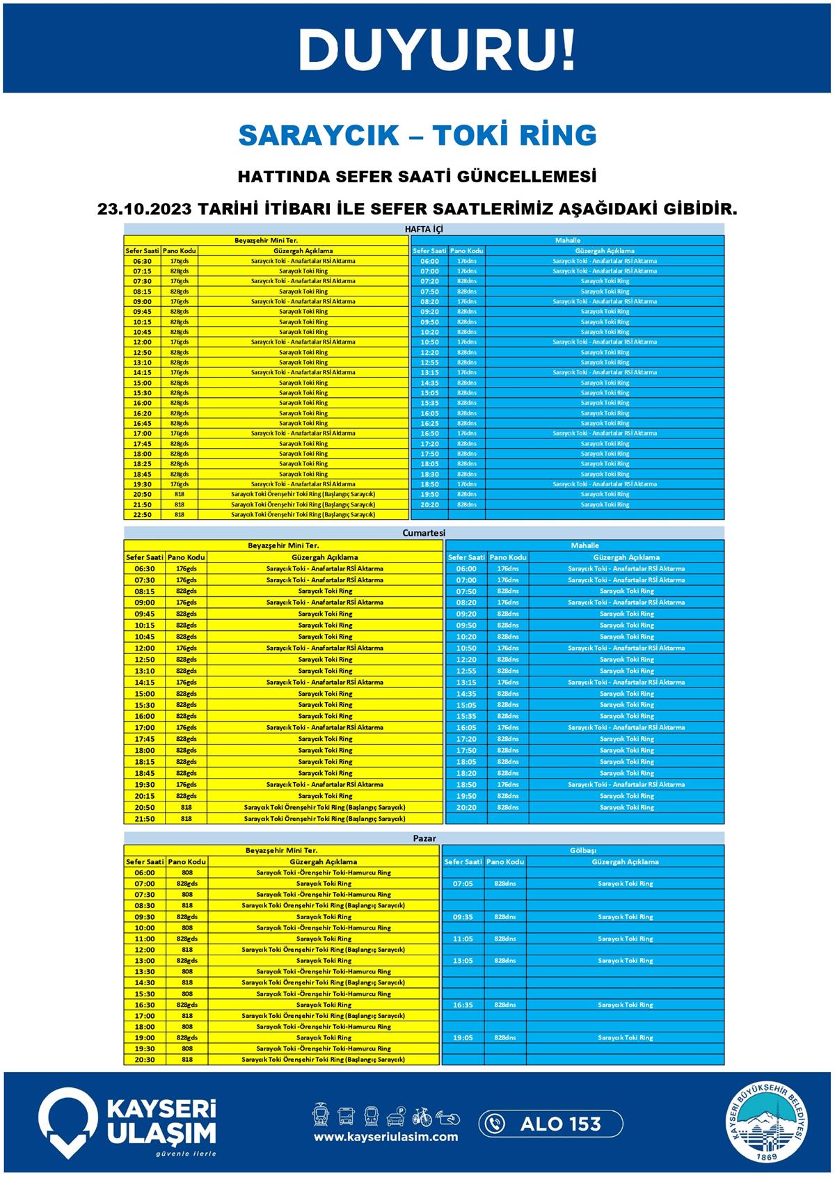 21 – 23 Ekim 2023 Tarihinden İtibaren Bazı Sefer Saat ve Güzergah Güncellemeleri Yapılmıştır.