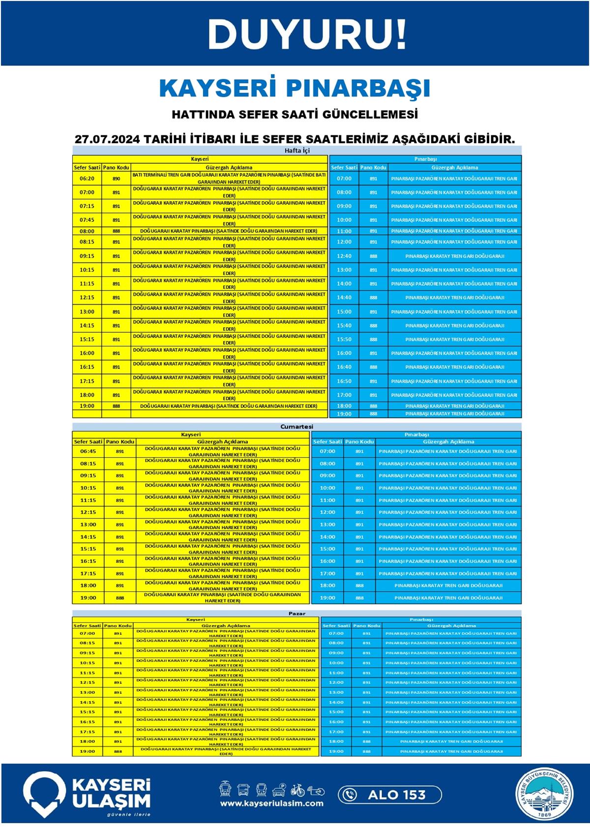 KAYSERİ PINARBAŞI HATTINDA SEFER SAATİ GÜNCELLEMESİ