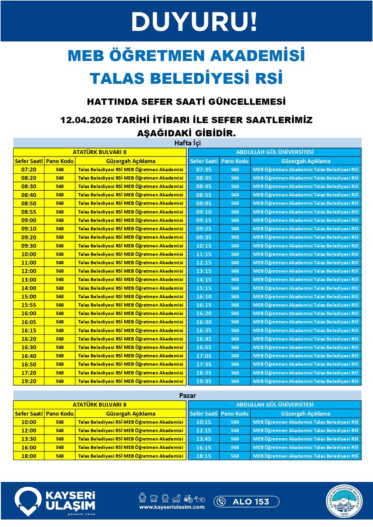 MEB ÖĞRETMEN AKADEMİSİ TALAS BELEDİYESİ RSİ HATTINDA SEFER SAATİ GÜNCELLEMESİ