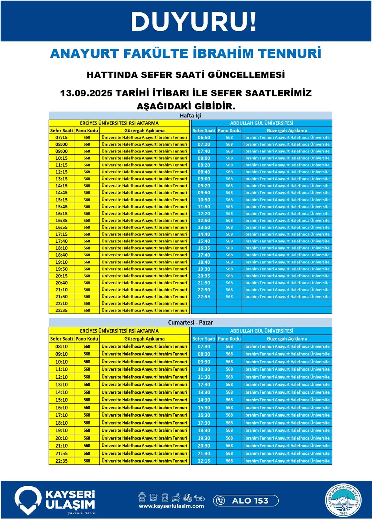 ANAYURT FAKÜLTE İBRAHİM TENNURİ HATTINDA SEFER SAATİ GÜNCELLEMESİ