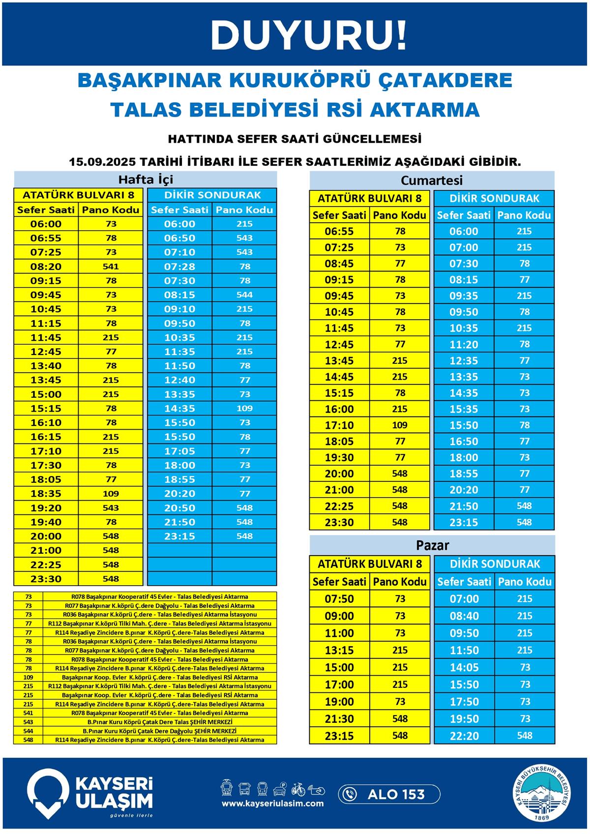 BAŞAKPINAR KURUKÖPRÜ ÇATAKDERE TALAS BELEDİYESİ RSİ AKTARMA HATTINDA SEFER SAATİ GÜNCELLEMESİ