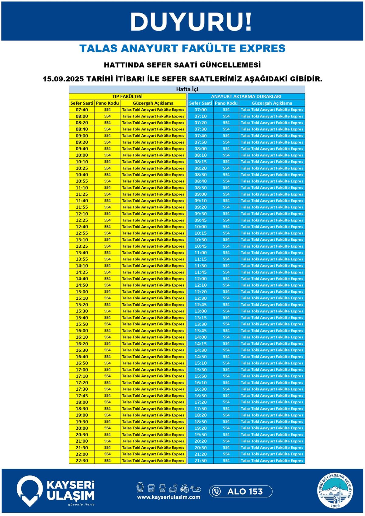 TALAS ANAYURT FAKÜLTE EXPRES HATTINDA SEFER SAATİ GÜNCELLEMESİ