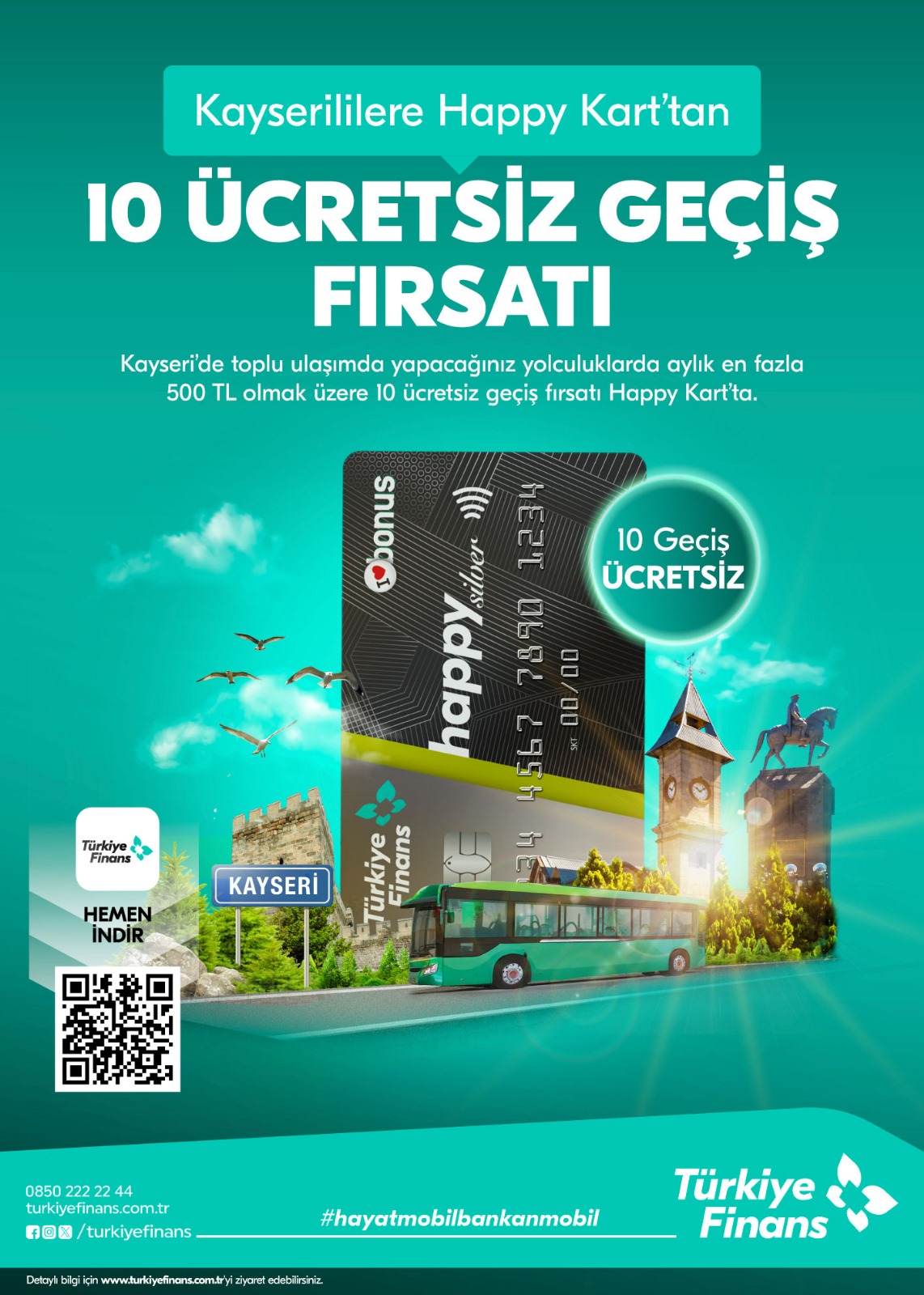 Kayseri Büyükşehir Belediye Başkanı Dr. Memduh Büyükkılıç, Türkiye Finans ile yapmış oldukları iş birliği çerçevesinde toplu ulaşım kullanıcılarına, Türkiye Finans “Happy Kart” banka ya da kredi kartı ile ödeme yapıldığında kampanya süresince her ay 10 ücretsiz geçiş fırsatı sunulacağını duyurdu.