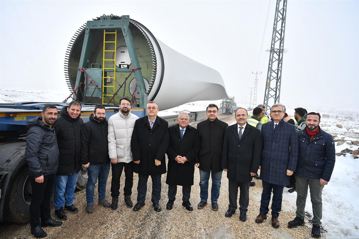 Türkiye’nin toplu ulaşım sektöründeki ilk Rüzgâr Enerji Santrali için türbinlerin dev parçalarından oluşan 80 araçlık sevkiyat, İzmir Alsancak Limanı’ndan Kayseri’ye doğru yola çıkarken, türbin parçaları peyderpey kente ulaşıyor. Büyükşehir Belediye Başkanı Dr. Memduh Büyükkılıç, projenin gerçekleştirildiği İncesu Fırınönü mevkiinde tırlarla taşınan türbinlere ait kanatlara yönelik incelemelerde bulundu.